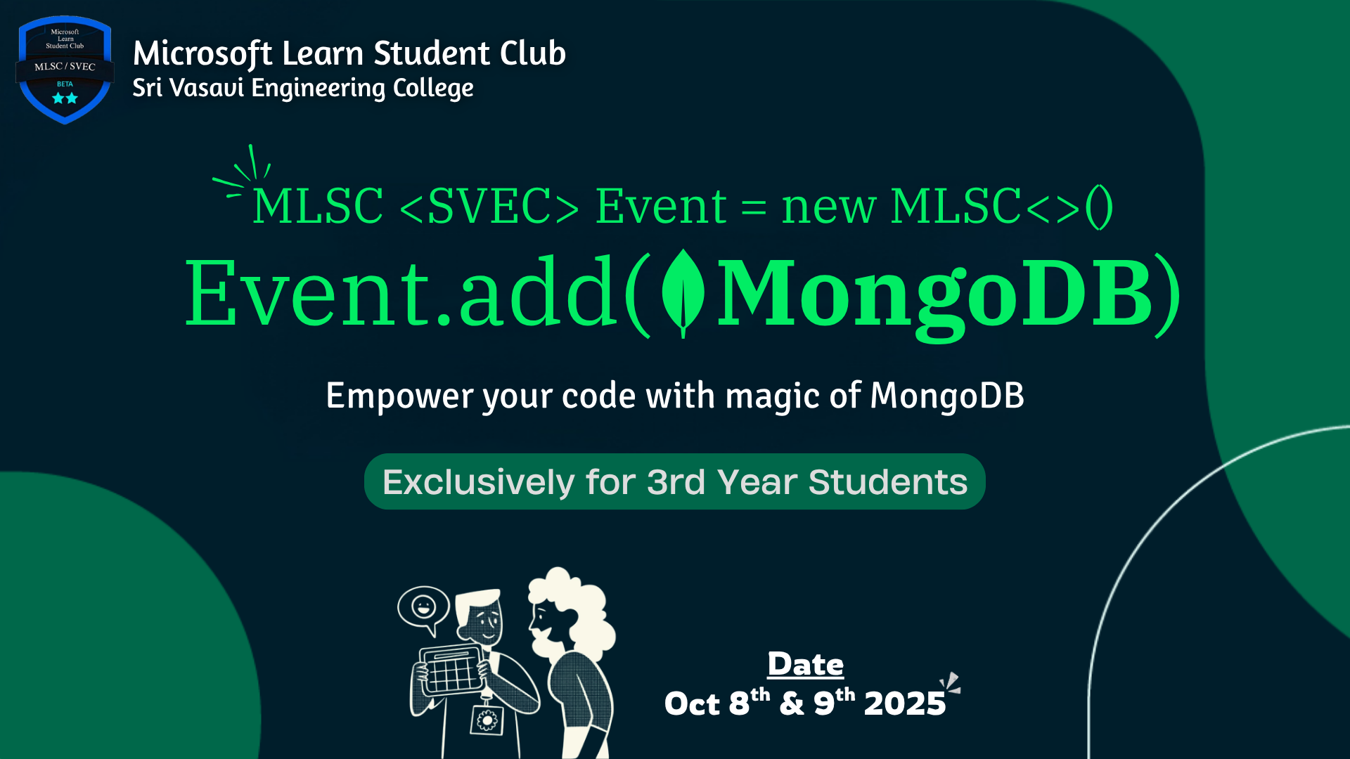 The Microsoft Learn Student Club (MLSC) of Sri Vasavi Engineering College proudly presents Event.add(MongoDB) — a dynamic, knowledge-driven session designed to immerse participants in the world of MongoDB, the leading NoSQL database for modern developers. This exclusive event, curated specifically for 3rd-year students, aims to bridge the gap between theoretical learning and practical application. Through engaging demonstrations, hands-on activities, and real-world examples, participants will discover how MongoDB empowers developers to build scalable, flexible, and high-performance applications with ease. Join us on October 8th and 9th, 2025, to empower your code with the magic of MongoDB and unlock the next level of your developer journey.